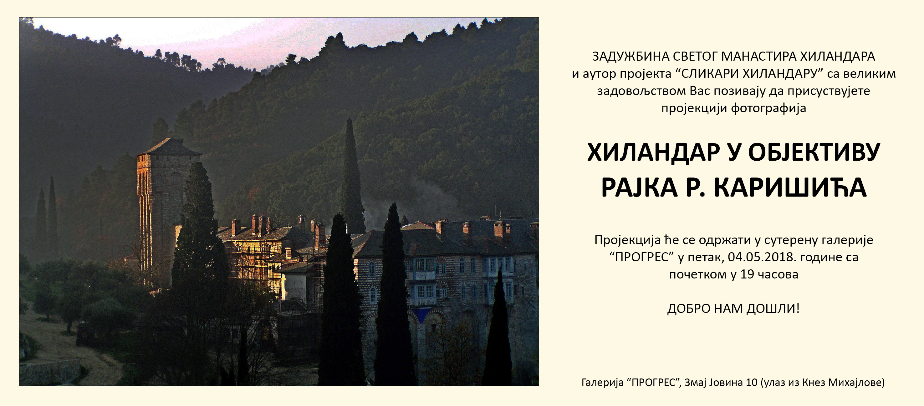 У оквиру пратећег програма изложбе СЛИКАРИ ХИЛАНДАРУ, у петак 4. маја 2018. у 19 часова, биће одржана пројекција фотографија Рајка Каришића. Фографије са мотивима Манастира Хиландара настале су последњих 14 година и представљају својеврстан, уметнички конципиран, водич кроз Хиландар.