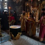 На позив хиландарског братства, са својим игуманом су дошли и дохијарски монаси, који су током службе појали за десном певницом. За левом певницом били су хиландарски монаси заједно са појцима хора „Преподобни Симеон Мироточиви“, који су прославили празник свог небеског заступника, као и јубилеј 10 година од почетка доласка у Хиландар и појања о великим празницима.