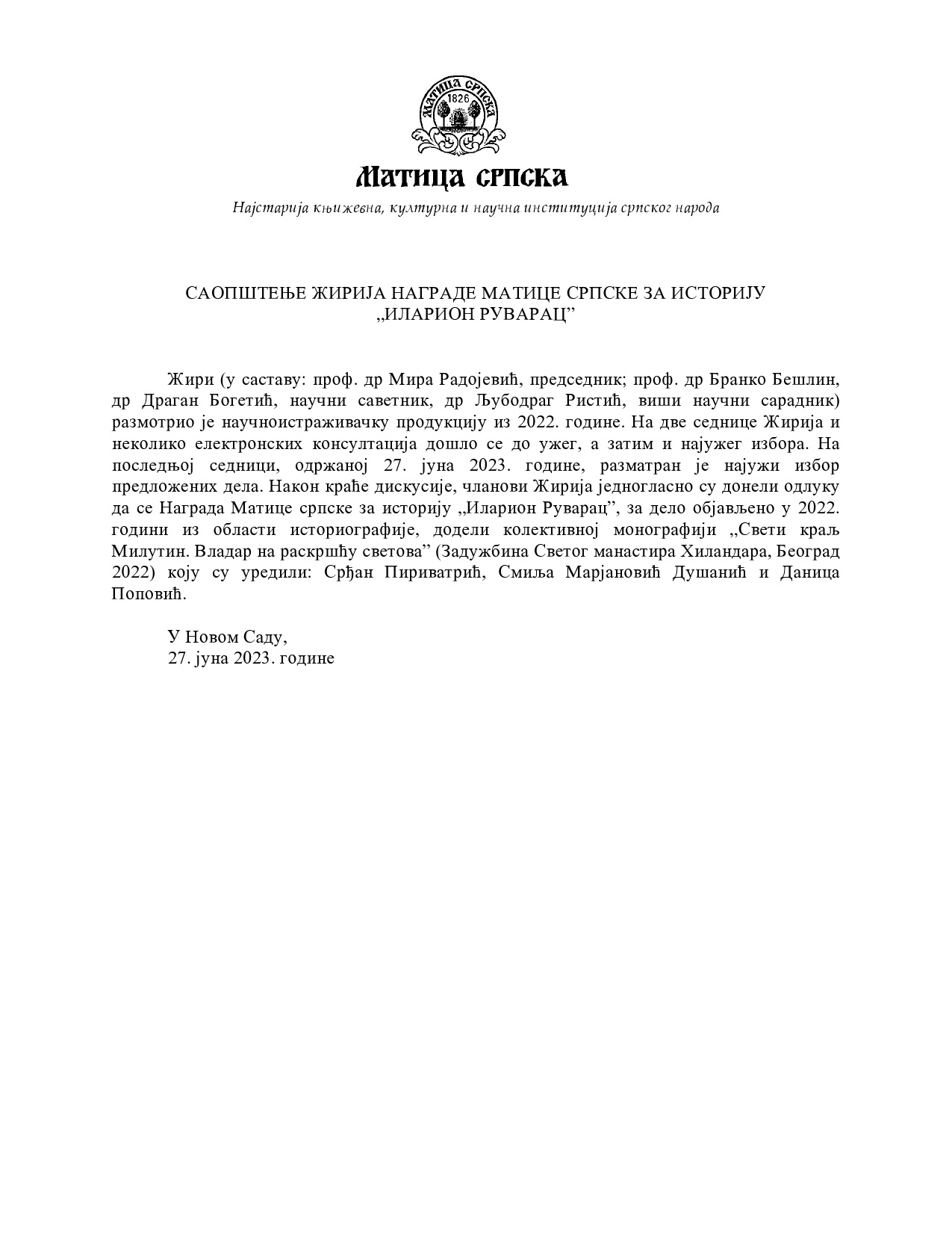 Чланови жирија награде Матице српске за историју „Иларион Руварац“ једногласно су донели одлуку да се награда за дело објављено у 2022. години из области историографије, додели колективној монографији „Свети краљ Милутин. Владар на раскршћу светова“.
