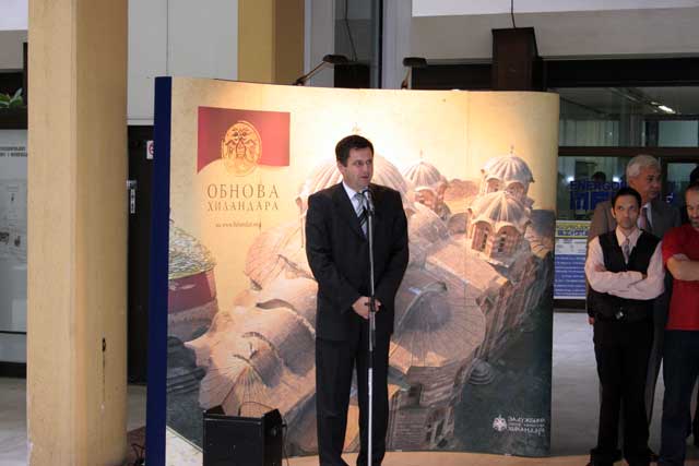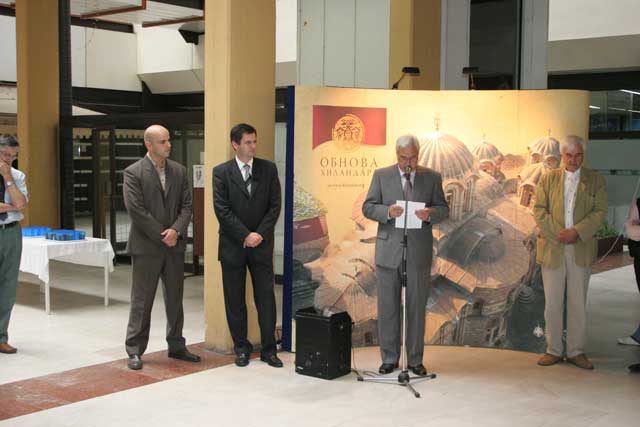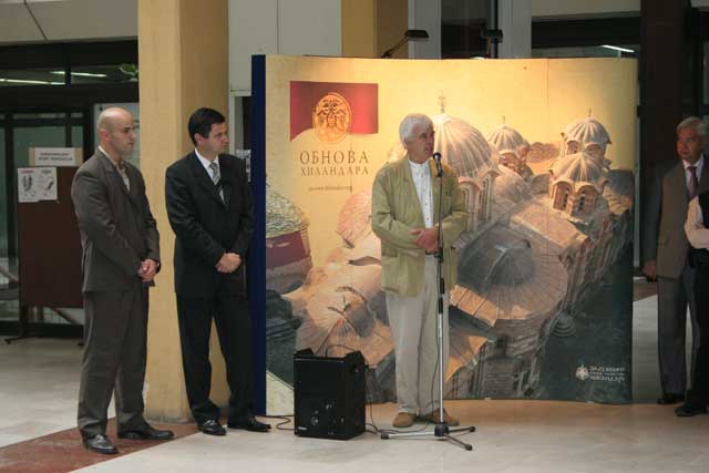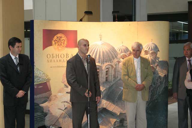У уводној речи госте је поздравио Владан Пантовић, доскорашњи директор Инграфа а сада помоћник генералног директора Енергопројекта за информационе технологије. Након тога је Мирко Ковачевић, главни архитекта Обнове Хиландара, упознао присутне са током и стручним аспектом овог великог подухвата. У кратком поздравном обраћању аутор фотографија Божо Вукоје је захвалио свима који су су својим присуством увеличавали овај догађај. На крају, изложбу је свечано отворио Игњат Туцовић, председник управног одбора система Енергопројект.