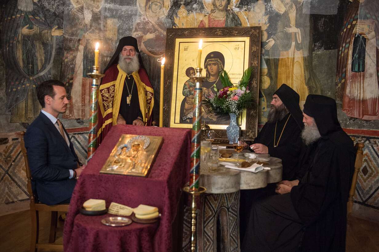 Након празничног ручка, по повратку у храм, по светогорском обичају, поје се многољетије архијереју. Овог пута су појци, са великим одушевљењем, појали многољетије и принцу Филипу. Не тако давно, на Светој Гори појање многољетија члановима православних владарских породица било је нешто уобичајено али последњих деценија за то нема повода. Због тога су искористили ову прилику и са радошћу обновили древну традицију.