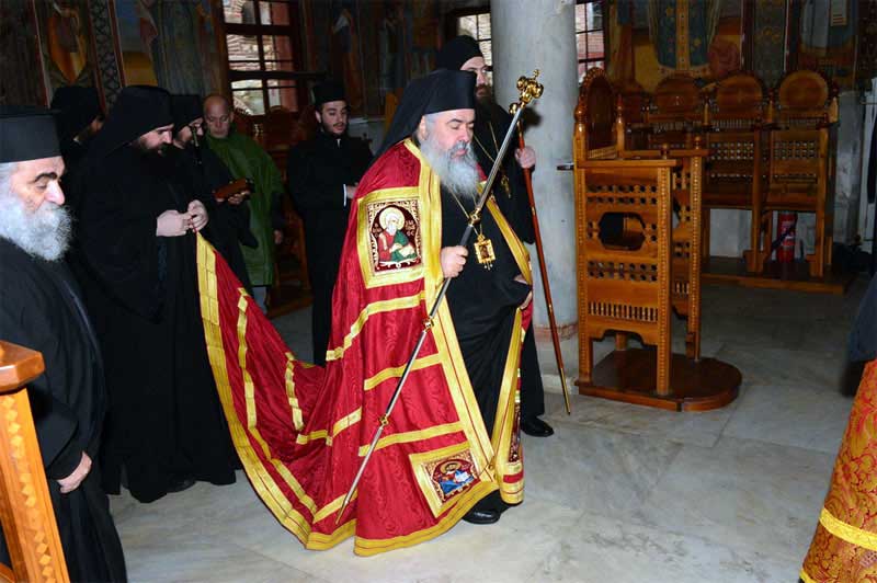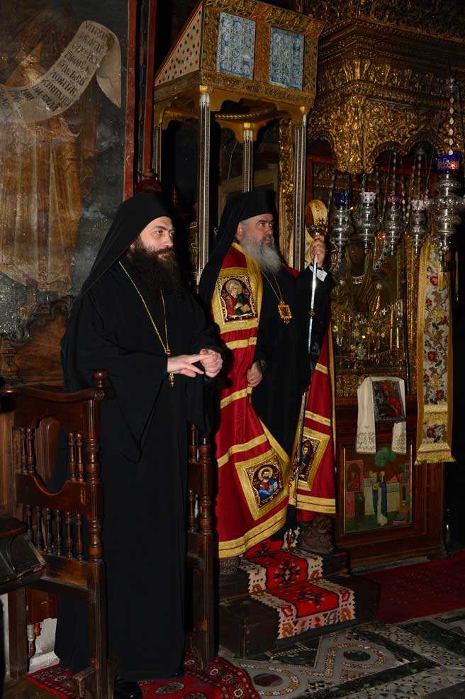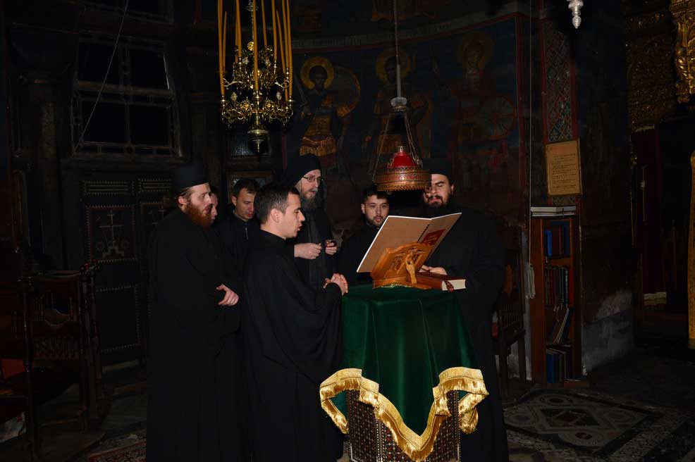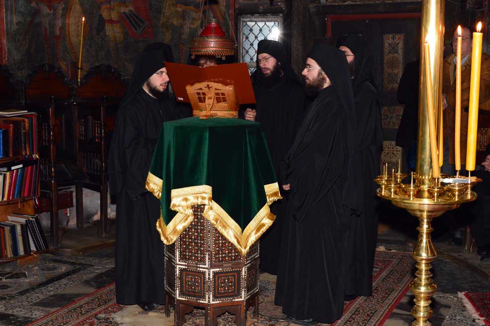 За десном певницом је појана служба коју је на грчком језику саставио блаженопочивши о. Герасим из Мале свете Ане на Светој Гори. За левом певницом је појана служба из Србљака, са допунама из нове службе, коју је по правилима црквене химнографије на црквенословенском језику саставио Игор Зиројевић, иначе дугогодишњи учитељ црквеног појања у Хиландару и сарадник манастира. Он је, за потребе манастирске славе, такође  мелотворио (компоновао) словенску службу, као и делове грчке службе.