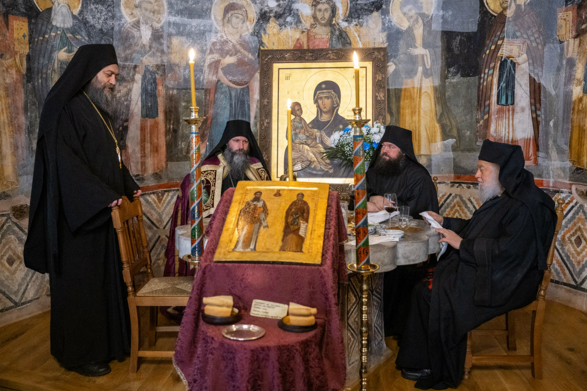 При крају Литургије, освећено је кољиво са ликом Преподобног Симеона Мироточивог, након чега је послужена славска трпеза за све присутне у хиландарској трпезарији.